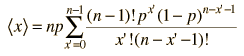 This seems a very simple expression for the mean of such a complicated function, but the result agrees with our intuition. If you throw a die, hoping to throw a "2", then the probability is 1/6. If you throw it 6 times, you would expect to get one throw with value "2". The mean or expected value for 6 throws is (1/6)(6) = 1. For such a simple expression, the proof that it is in fact the mean is rather involved. The following approach is after Appendix D of Rohlf's Modern Physics. From the definition of the mean using a distribution function, the binomial mean is ![]() The goal is to reduce this expression to just np. Since the first term in the sum is zero, since x=0, we can replace the sum with a sum starting from 1. ![]() Now cancel the common factor of x appearing in numerator and denominator. ![]() Since the summation index is a dummy variable, we make the change of variables x' = x - 1. ![]() Now factor out np. ![]() The terms in the summation above are just the binomial function for n-1 trials, and you are summing it over all values of x - so that sum must be just 1. The expression then reduces to the desired expression for the mean.