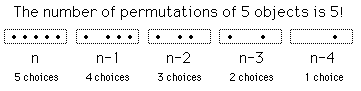 PermutationsThe permutation relationship gives you the number of ways you can choose r objects or events out of a collection of n objects or events. ![]() As in all of basic probability, the relationships come from counting the number of ways specific things can happen, and comparing that number to the total number of possibilities. If you are making choices from n objects, then on your first pick you have n choices. On your second pick, you have n-1 choices, n-2 for your third choice and so forth. As illustrated before for 5 objects, the number of ways to pick from 5 objects is 5! . ![]() Note that your choice of 5 objects can take any order whatsoever, because your choice each time can be any of the remaining objects. So we say that there are 5 factorial = 5! = 5x4x3x2x1 = 120 ways to arrange five objects. In general we say that there are n! permutations of n objects. Now if you are going to pick a subset r out of the total number of objects n, like drawing 5 cards from a deck of 52, then a counting process can tell you the number of different ways you can do that. For the first pick, you have n choices, then n-1 and so on down to n-r+1 for the last pick. The number of ways you can do it is then ![]() which can be expressed in the standard form ![]() The number of permutations of r objects out of n is sometimes what you need, but it has the drawback of overcounting if you are interested in the number of ways to get distinguishable collections of objects or events. For the purposes of card playing, the following ways of drawing 3 cards are equivalent: ![]() So the permutation relationship overcounts the number of ways to choose this combination if you don't want to make a distinction between them based on the order in which they were chosen. The factor of overcounting in this case is 6 = 3!, the number of permutations of 3 objects. The number of distinguishable collections of r objects chosen from n is obtained by dividing the permutation relationship by r! . It is usually written ![]() This quantity nCr is called the "combination" and represents the probability of picking r distinguishable outcomes out of n without regard to the order of picking each outcome. For a group of n objects or events which are broken up into k subsets, the above relationship is generalizable to give the number of distinguishable permutations of the n objects. ![]() Here the terms in the denominator are the populations of the k subsets. An application of this relationship is in determining the number of possible energy states in an energy distribution for distinguishable particles. |