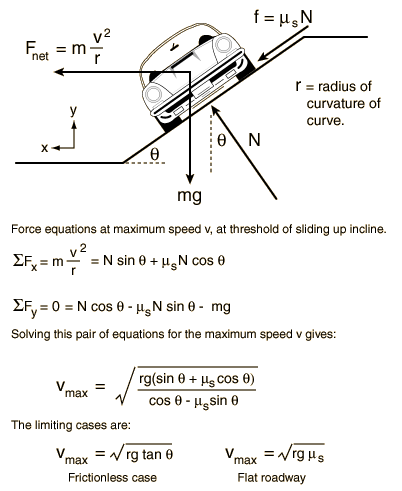 Maximum Speed on Banked Roadway![]() The concepts used in this analysis included Newton's second law, centripetal acceleration, static friction, and the division of vectors into components. The horizontal components of the friction and normal force are constrained to provide the centripetal acceleration in the x direction to keep the car moving in a circle. The sum of the y components of all the forces must be zero since there is no acceleration in that direction. |
