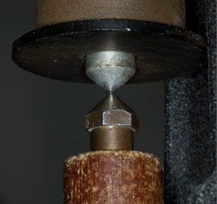 | On the insulating bob has been placed a metal ring with a sharp edge. It fills most of the space between the front wire and the back wire positioned behind the waxed tape. The sharp edge concentrates the electric field and makes it easier for a spark to jump to the ring and from the ring to the back wire, passing through the tape to make the mark. |