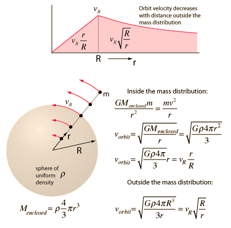Orbit Speed Inside and Outside a Mass DistributionThe orbit speed of an object is a measure of the amount and distribution of the mass that is attracting it gravitationally. To examine this dependence, consider a sphere of uniform density ρ which is diffuse enough to permit the orbiting of a mass m within the radius of the mass distribution. For this idealized case, the inverse square law form of the law of gravity along with the centripetal force relationship can be used to calculate the orbit velocity for a circular orbit. This calculation is made possible by the fact that the orbiting mass experiences a net attraction only by that mass inside its orbit, and the mass outside its orbit exerts a net zero force. ![]() Upon calculating the circular orbit velocity, we find that inside the spherical mass distribution, the orbit velocity increases with radius, reaching a maximum at the radius of the mass distribution. Then if falls off as the radius increases, following the relationship: ![]() This calculation was done for a spherical mass, but for a uniform disc of mass like an idealized galaxy, the orbital velocity of material outside the detectable mass of the galaxy would be expected to fall off as some factor times the inverse square root of the radius. Surprisingly, the orbital velocity does not fall off at the edge of the detectable matter, staying almost constant well beyond the detectable edge of the galaxy. This is the nature of the evidence for dark matter which exceeds the visible matter by about a factor of six.