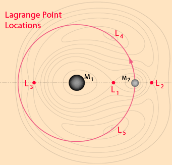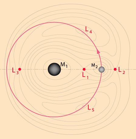 Three-Body Equipotential SurfacesA mechanical system with three objects, say the Earth, Moon and Sun, constitutes a three-body problem. The three-body problem is famous in both mathematics and physics circles, and mathematicians in the 1950s finally managed an elegant proof that it is impossible to solve. However, approximate solutions can be very useful, particularly when the masses of the three objects differ greatly. One of the contributions of Lagrange was to plot contours of equal gravitational potential energy for systems where the third mass was very small compared to the other two. Below is a sketch of such equipotential contours for a system like the Earth-Moon system. The equipotential contour that makes a figure-8 around both masses is important in assessing scenarios were one partner loses mass to the other. These equipotential loops form the basis for the concept of the Roche lobe. ![]() Contours of Equal Gravitational PotentialOne of Lagrange's observations from the potential contours was that there were five points at which the third body could be at equilibrium, points which are now referred to as Lagrange points. ![]() The Lagrange Points for a system like the Earth-Moon systemThe Lagrange points L1, L2, and L3 are unstable equilibrium points. Like standing a pencil on its point, it is possible to achieve equilbrium, but any displacement away from that equilibrium would lead to forces that take it further away from equilibrium. Remarkably, the Lagrange points L4 and L5 are stable equilibrium points for the small mass in the three-body system and this three-body geometry could be maintained as M2 orbited about M1.