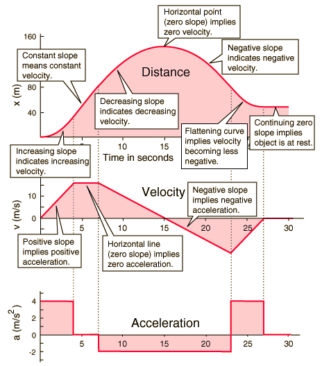 A considerable amount of information about the motion can be obtained by examining the slope of the various graphs. The slope of the graph of position as a function of time is equal to the velocity at that time, and the slope of the graph of velocity as a function of time is equal to the acceleration. |