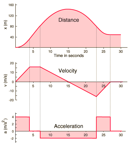 Motion GraphsConstant acceleration motion can be characterized by motion equations and by motion graphs. The graphs of distance, velocity and acceleration as functions of time below were calculated for one-dimensional motion using the motion equations in a spreadsheet. The acceleration does change, but it is constant within a given time segment so that the constant acceleration equations can be used. For variable acceleration (i.e., continuously changing), then calculus methods must be used to calculate the motion graphs. ![]()