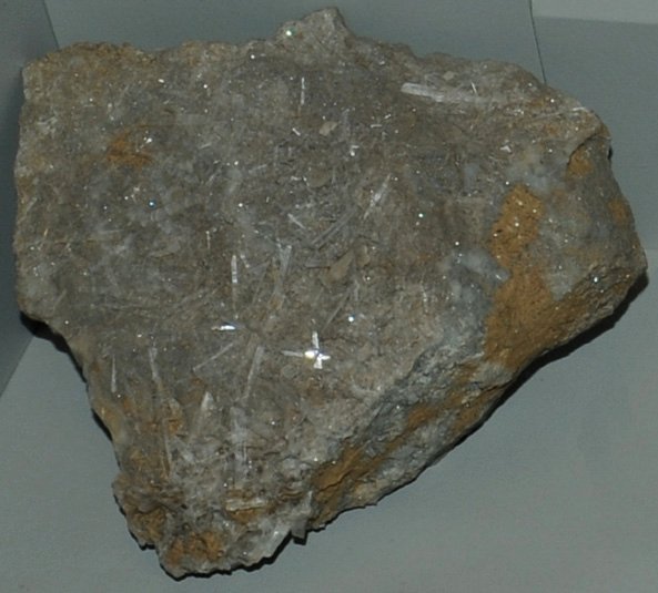 This sample of bikitaite is displayed in the Smithsonian Museum of Natural History. Bikitaite is a silicate mineral of lithium with the composition LiAlSi2O6.H2O. The sample at left is about 18 cm across and is from Foote Mineral Co. spodumene mine, Kings Mountain, North Carolina.