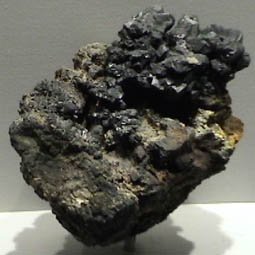 This sample of bornite is displayed in the Smithsonian Museum of Natural History. Bornite is an sulfide mineral of copper and iron with the composition Cu5FeS4. This sample is about 3X3 cm and is from Shaba, D. R. Congo.