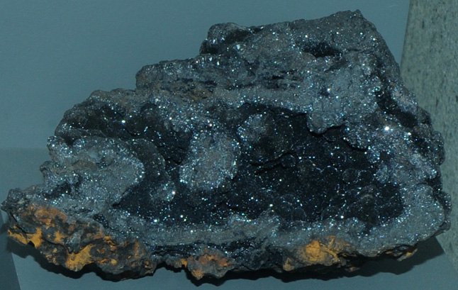This sample of chalcophanite is displayed in the Smithsonian Museum of Natural History. Chalcophanite contains zinc and manganese with the composition (Zn,Fe,Mn)Mn3O7.3H2O. The sample at left is about 14 cm across and is from Sterling Hill mine, Ogdensburg, New Jersey.