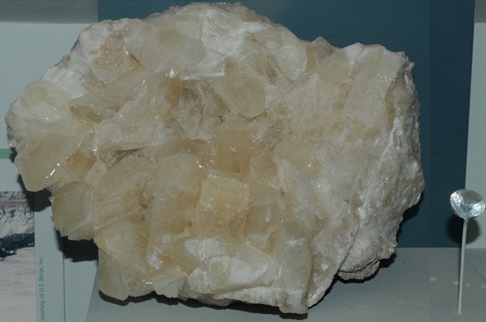 This sample of colemanite is displayed in the Smithsonian Museum of Natural History. Colemanite is an oxide of calcium and boron with the composition CaB3O4(OH)3.H2O. The sample at left is about 18 cm across and is from Lower Biddy McCarthy mine, Ryan, California. The accompanying colemanite gem is 14.9 carats and is from Death Valley, Inyo County, California.