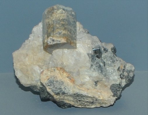 These samples of cordierite are displayed in the Smithsonian Museum of Natural History. Cordierite is a silicate mineral with the composition Mg2Al4Si5O18. The sample at left is about 8 cm across and is from Kragero, Telemark, Norway.
