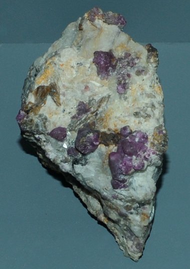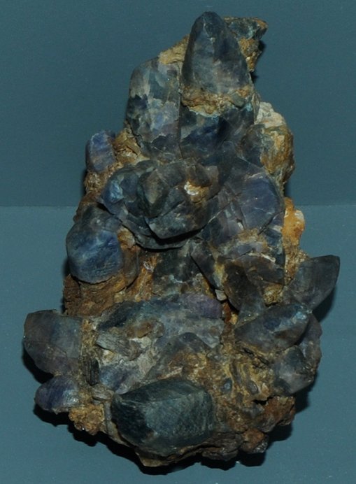These samples of corundum are displayed in the Smithsonian Museum of Natural History. Corundum is a oxide mineral of aluminum with the composition Al2O3. The sample at left is about 6 cm across and is from Franklin, New Jersey.