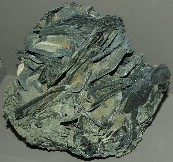 These samples of covellite are displayed in the Smithsonian Museum of Natural History. Covellite is a sulfide mineral of copper with the composition CuS. The sample at left is about 18 cm across and is from Leonard mine, Butte, Montana.