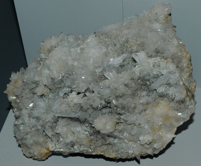 These samples of creedite are displayed in the Smithsonian Museum of Natural History. Creedite is a sulfate mineral that contains fluorine with the composition Ca3Al2SO4(OH)2F8.2H2O. The sample at left is about 18 cm across and is from Santa Eulalia, Chihuahua, Mexico.