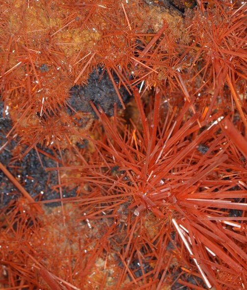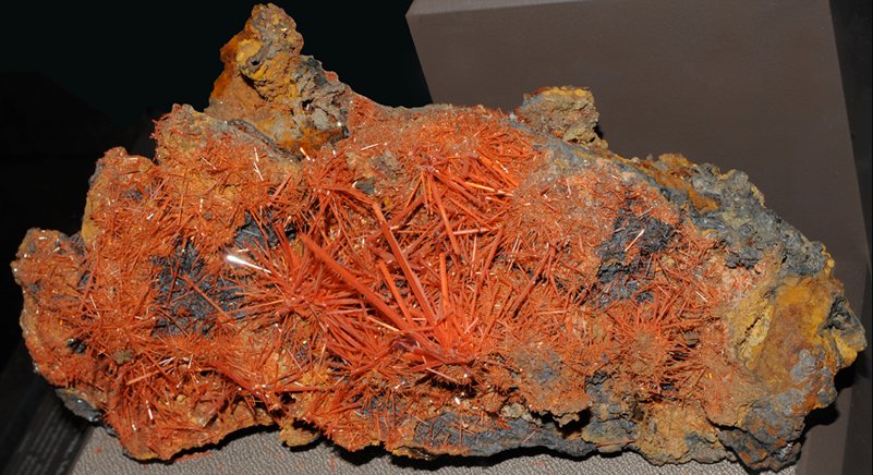 Crocoite is an oxide mineral of lead and chromium (lead chromate) with composition PbCrO4. This sample is about 12x22 cm and is from Red Lead mine, Dundas, Tasmania, Australia. This sample is on display at the Smithsonian Museum of Natural History. From their description "Crocoite's color, always orange or reddish-orange, comes from chromium - a valuable metal first extracted from this rare mineral. The best crocoite in the world is found in Tasmania where it was once mined for lead."