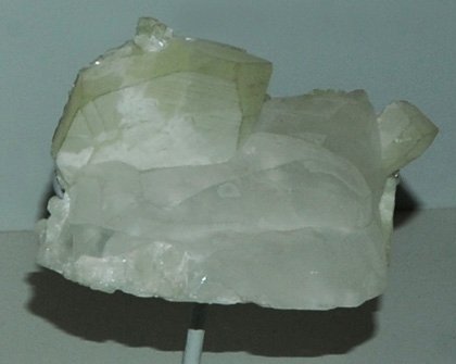 These samples of datolite are displayed in the Smithsonian Museum of Natural History. Datolite is a silicate mineral of boron and calcium with the composition CaBSiO4(OH). The sample at left is about 12 cm across and is described as datolite with quartz.