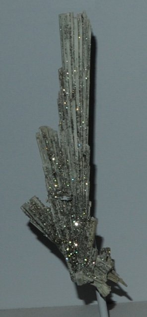 This sample of elpidite is displayed in the Smithsonian Museum of Natural History. Elpidite is a silicate mineral of zirconium with the composition Na2ZrSi6O15.3H2O. The sample at left is about 1x12 cm and is from Mont Saint-Hilaire, Quebec, Canada. The sample is described as elpidite with pyrite, the pyrite forming the reflective flakes on the sample.