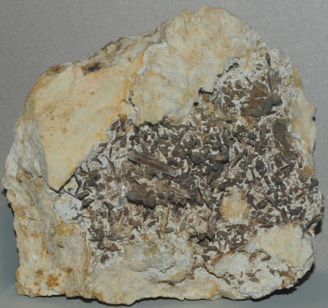 This sample of eosphorite is displayed in the Smithsonian Museum of Natural History. Eosphorite is a phosphate mineral with the composition (Mn,Fe)AlPO4(OH)2.2H2O. The sample at left is about 30 cm across and is from Black Mountain, Rumford, Maine.
