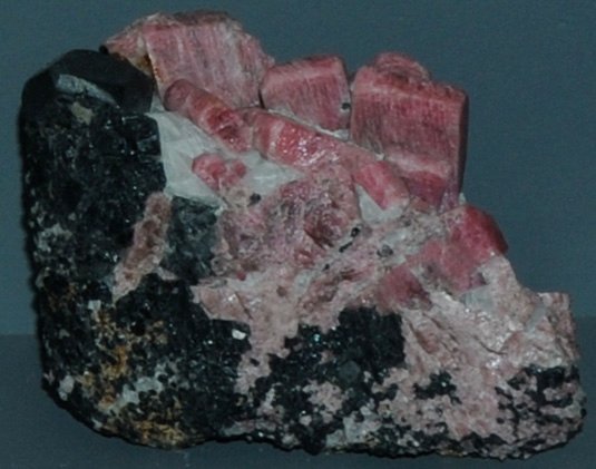 These samples of gahnite are displayed in the Smithsonian Museum of Natural History. Gahnite is a oxide mineral of zinc and aluminum with the composition ZnAl2O4. The sample at left is about 10 cm across and is from Franklin, New Jersey. It is described as gahnite with rhodonite.