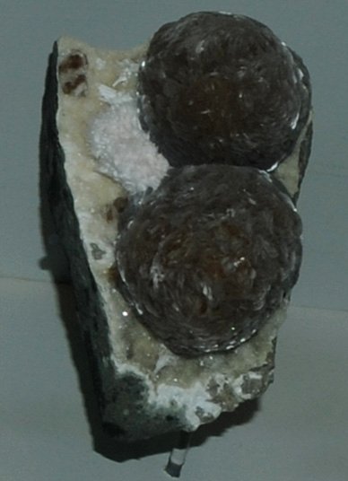 This sample of gyrolite is displayed in the Smithsonian Museum of Natural History. Gyrolite is a silicate mineral with the composition NaCa16AlSi24O60(OH)8.14H2O. The sample at left is about 6 x 8 cm across and is from Bombay, Maharashtra, India. It is described as gyrolite with mesolite and calcite.