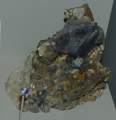 These samples of herderite are displayed in the Smithsonian Museum of Natural History. Herderite is a phosphate mineral of beryllium with fluorine and it has the composition CaBePO4(F,OH). The sample at left is about 5 cm across and is from Gilgit, Northern Areas, Pakistan. The sample at right is from Fletcher mine, North Groton, New Hampshire. It is about 5 cm wide.