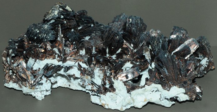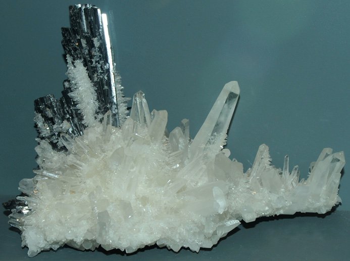 These samples of hubnerite are displayed in the Smithsonian Museum of Natural History. Hubnerite is a oxide mineral of tungsten and manganesewith the composition MnWO4. The sample at left is about 25 cm across and is from Huallopon mine, Pasto Bueno, Ancash, Peru. A forest of quartz crystals surround the shiny, gray hubnerite.