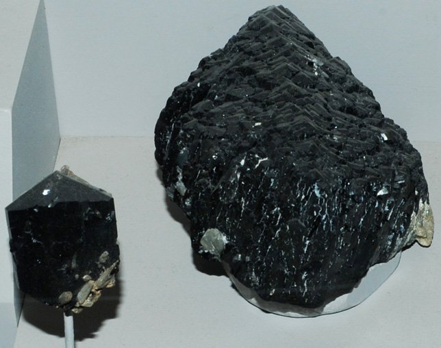 This sample of ilvaite is displayed in the Smithsonian Museum of Natural History. Ilvaite is a silicate mineral with the composition CaFe3O(Si2O7)(OH)4. The sample at left is about 10 cm across and is from Seriphos Island, Cyclades, Greece.