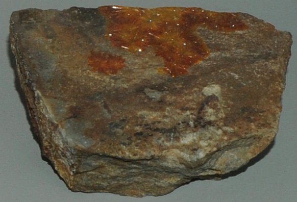 This sample of kasolite is displayed in the Smithsonian Museum of Natural History. Kasolite is a silicate mineral of uranium and lead with the composition Pb(UO2)SiO4.H2O. The sample at left is about 8 cm across and is from Shinkolobwe mine, Shaba, D. R. Congo.