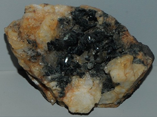 This sample of kulanite is displayed in the Smithsonian Museum of Natural History. Kulanite is a phosphate mineral of barium and manganese along with three members of the big 8 elements, iron, magnesium and aluminum. It has the composition Ba(Fe,Mn,Mg)2Al2(PO4)3(OH)3. The sample at left is about 8 cm across and is from Cross Cut Creek, Rapid Creek, Yukon Territory, Canada. It is described as kulanite with penikisite.
