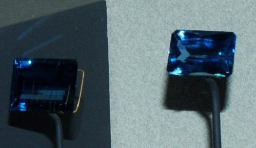 At left above is a kyanite sample from Monte Campione, Uri, Switzerland. It is about 15 x 25 cm. At right above are long slender blue crystals of kyanite on the order of 25 to 30 cm long. They are from Minas Gerais, Brazil.