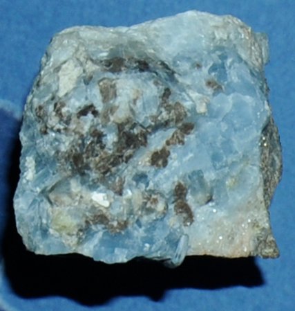 This sample of merwinite is displayed in the Smithsonian Museum of Natural History. Merwinite is a silicate mineral with the composition Ca3Mg(SiO4)2. The sample at left is about 8 cm and is part of the collection of Cretaceous Period minerals from Crestmore, California. It is described as merwinite with blue calcite.