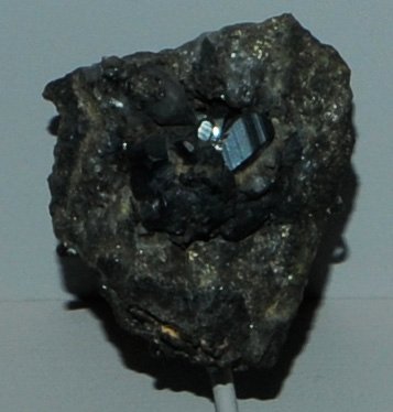 This sample of miargyrite is displayed in the Smithsonian Museum of Natural History. Miargyrite is an sulfide mineral of antimony and silver with the composition AgSbS2 . This sample is about 6x6 cm and is from Baia Sprie, Crisana-Maramures, Romania.
