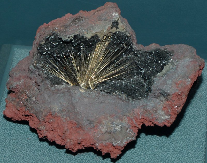 This sample of millerite is displayed in the Smithsonian Museum of Natural History. Millerite is a sulfide mineral of nickel with the composition NiS. The sample at left is about 15 cm across and is from Sterling mine, Antwerp, New York. It's caption reads "The delicate tuft of needlelike millerite crystals grew to fill a pocket in hematite, creating t his world-famous specimen."