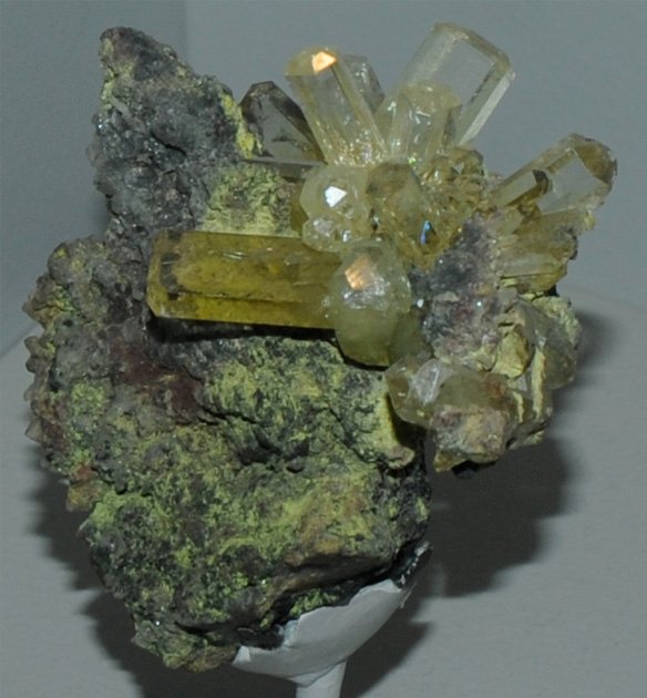 This sample of mimetite is displayed in the Smithsonian Museum of Natural History. Mimetite contains lead, arsenic and chlorine with the composition Pb5(AsO4)3Cl. This sample is about 5x5 cm and is from Tsumeb, Namibia.
