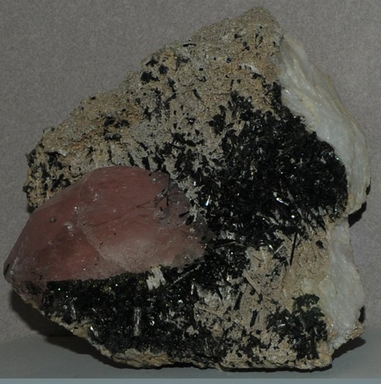 | This sample is described as morganite with elbaite and albite. It is about 30 cm across and is from Corrego do Urucum, Minas Gerais, Brazil.