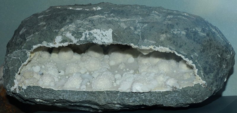 These samples of okenite are displayed in the Smithsonian Museum of Natural History. Okenite is a silicate mineral of calcium with the composition Ca10Si18O46.18H2O. The sample above is about 25 cm across and is from Bombay, Maharashtra, India.