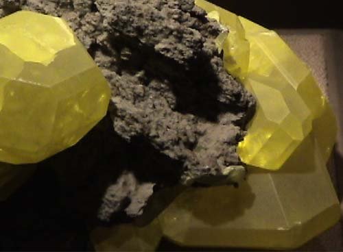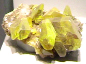 Sulfur often occurs almost pure form, but large crystals like this are rare. This sample, displayed in the Smithsonian Museum of Natural History, originated in Cozzodizi, Agrigento, Sicilia, Italy. The sample is 8-10cm across.