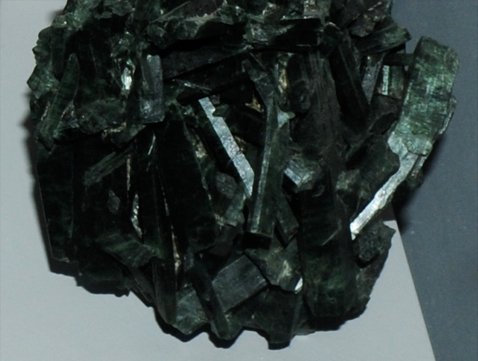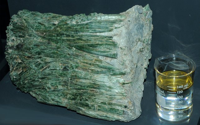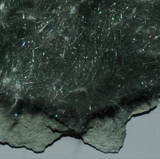 This sample of actinolite has a very different appearance, forming in a fibrous mass. The sample is about 18x16 cm and is from Fairfax quarry, Centreville, Virginia. It has an appearance similar to those magnesium silicates which are collectively labeled "asbestos".