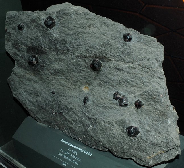This is a sample of almandine-bearing schist from Fort Wrengell, Alaska. It is about 25 x 30 cm. |  |