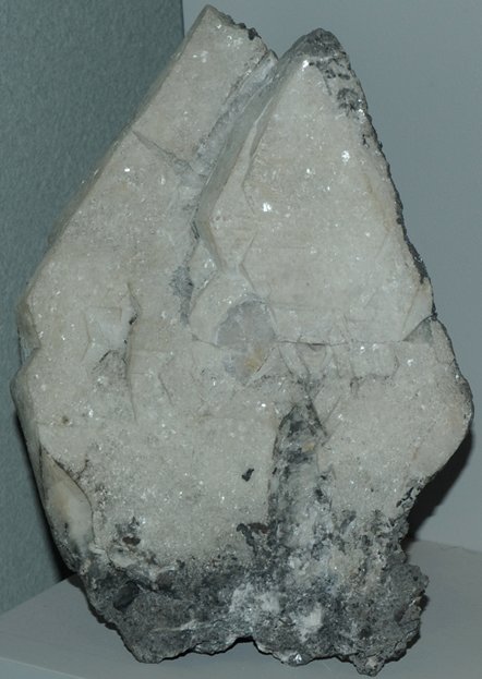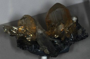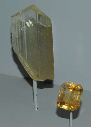 These samples of anglesite are displayed in the Smithsonian Museum of Natural History. Anglesite is a sulfate mineral of lead with the composition PbSO4. The origin of the specimens at left is Tsumeb, Namibia. The sample at far left is about 3x4 cm. The gem is labeled at 77.5 carats.