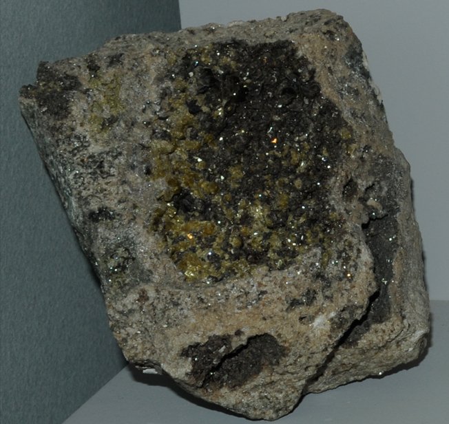 Augite is a silicate with composition (Ca, Mg,Fe)2(Si,Al)2O6. This sample is about 9 cm across cm and is from Sterling Hill mine, Ogdensburg, New Jersey. These samples are on display at the Smithsonian Museum of Natural History.