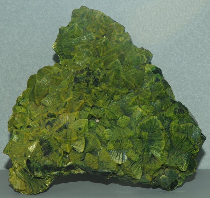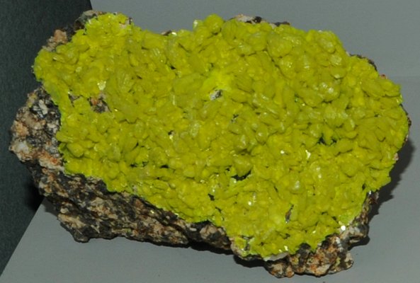 This sample of meta-autunite is displayed in the Smithsonian Museum of Natural History. Meta-autunite is a phosphate mineral of uranium with the composition Ca(UO2)2(PO4)2.6H2O. The sample at left is about 12 cm across and is from Central Massif, France.