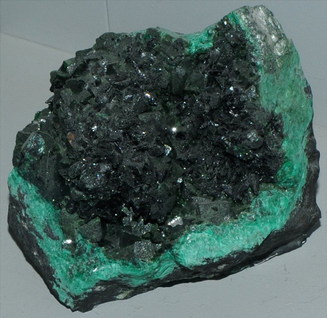 This sample of bayldonite is displayed in the Smithsonian Museum of Natural History. Bayldonite contains copper, zinc and lead and arsenic with the composition (CuZn)3Pb(AsO4)2(OH)2.H2O. This sample is about 5x6 cm and is from Tsumeb, Namibia. The bayldonite is formed with olivenite and adamite.