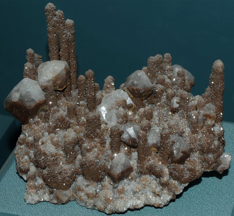 This sample is described as calcite with goethite. It is about 30 cm wide and is from Potosi mine, Santa Eulalia, Chihuahua, Mexico. Millions of microscopic calcite crystals make up the stalactites, which are colored red by goethite. As they grew in a small cavity of limestone, a change in conditions resulted in a second generation of large, blocky calcite crystals.
