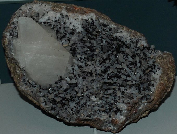 This is calcite with galena and chalcopyrite. The sample is about 20 x 40 cm and is from Joplin, Missouri.