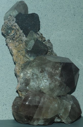 The collection of calcite crystals at right is from Elmwood mine, Carthage, Tennessee. The overall sample size is about 20x45 cm.
