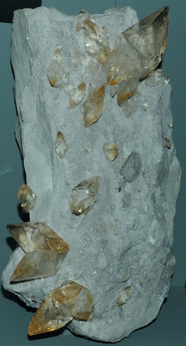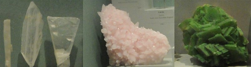 The three clear calcite crystals at left above, the tallest being about 25cm, are just the beginning of the vast variety of forms in which calcite appears. Since it is soluble in acidic water, it can be dissolved and recrystallized with a large number of different inclusions. All of the samples pictured here are on display at the Smithsonian Museum of Natural History.