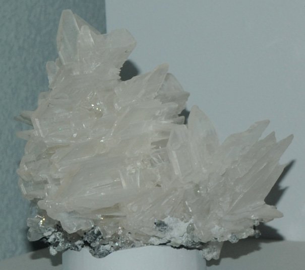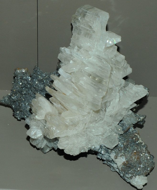 This sample of cerussite is displayed in the Smithsonian Museum of Natural History. Cerussite is a carbonate mineral of lead with the composition PbCO3. This sample is about 14x10 cm and is from Tsumeb, Namibia.