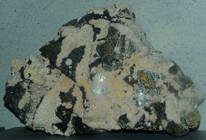 This chalcopyrite sample shows large brassy crystals which are the chalcopyrite. They are coated with white dolomite and black sphalerite. It is is from Bayard, New Mexico and is about 30 cm across.