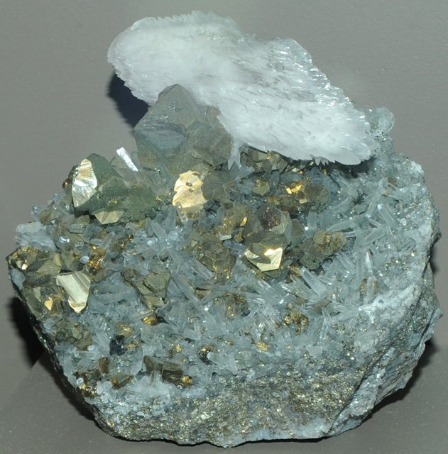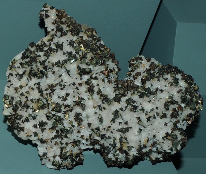 These samples of chalcopyrite are displayed in the Smithsonian Museum of Natural History. Chalcopyrite is a sulfide mineral of copper and iron with the composition CuFeS2. This sample is about 10x7 cm and is from Moonta mine, South Australia. It is formed with quartz.