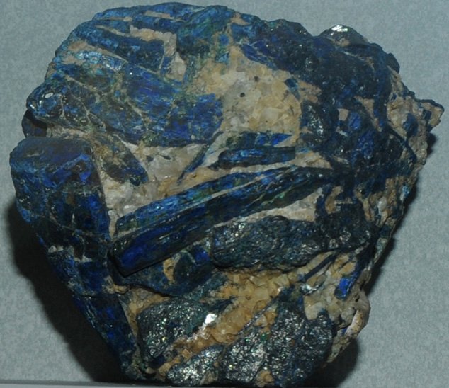 This sample of chalcostibite is displayed in the Smithsonian Museum of Natural History. Chalcostibite is a sulfide mineral of copper and antimony with the composition CuSbS2. This sample is about 7x7 cm and is from Rar El Ans, Cherrat, Morocco. The sample is described as chalcostibite altering to azurite with calcite.