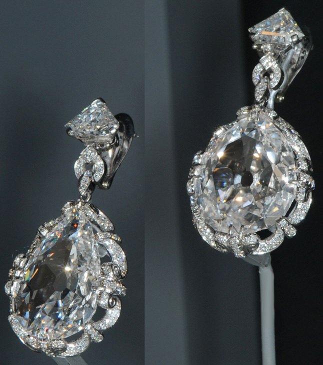 The diamond above right is the "Portuguese Diamond". It is of size 127.01 carats and is of unknown origin. It is the largest cut diamond in the Smithsonian collection. It was once owned by Peggy Hopkins Joyce, an actress in the Ziegfeld Follies. Despite its name, it has no documented connection with Portugal. The two diamonds above are shown at the same scale.